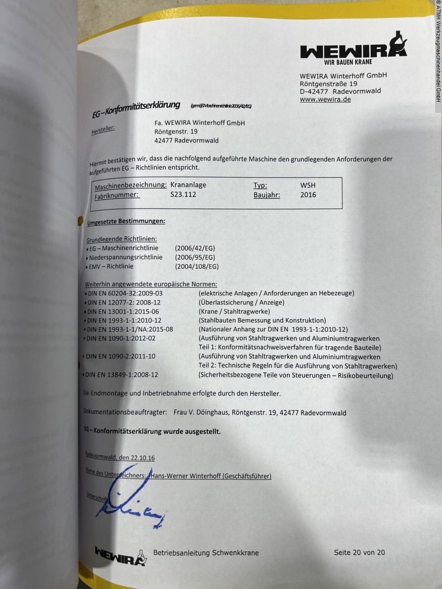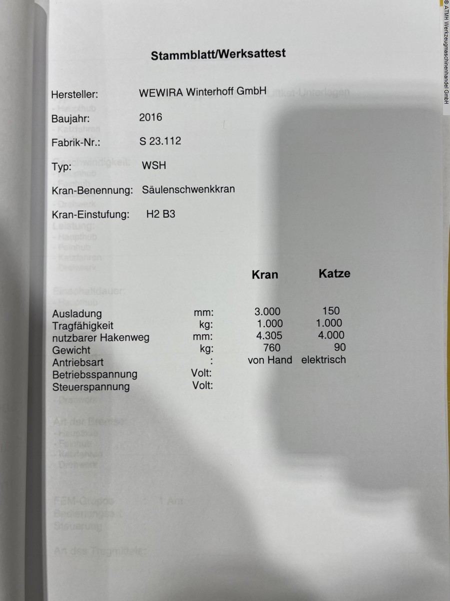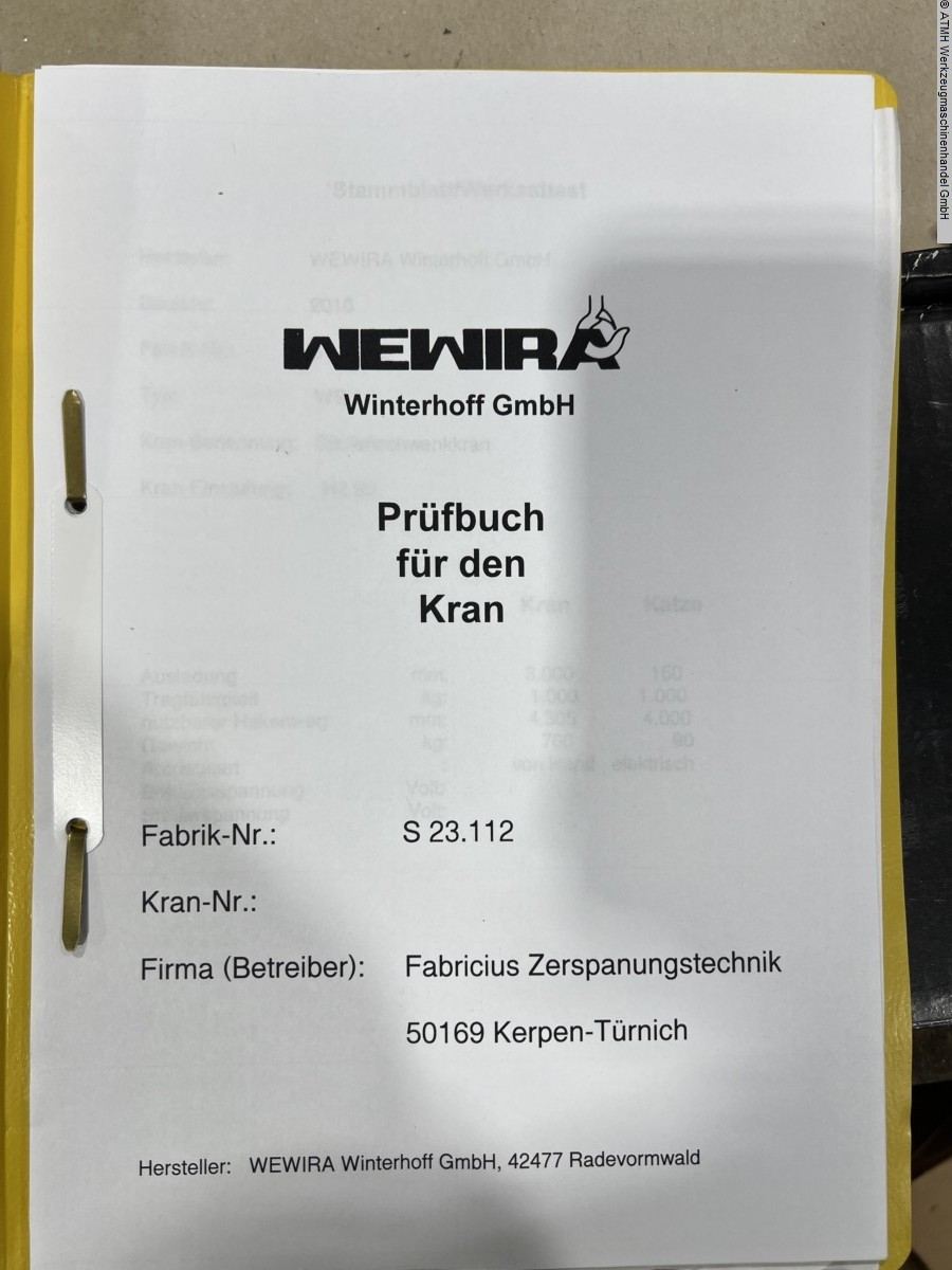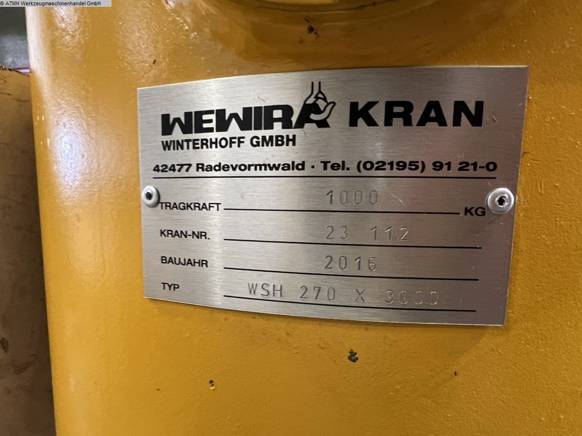 WEWIRA WSH 270x3000 1000kg pillar slewing crane incl. test book